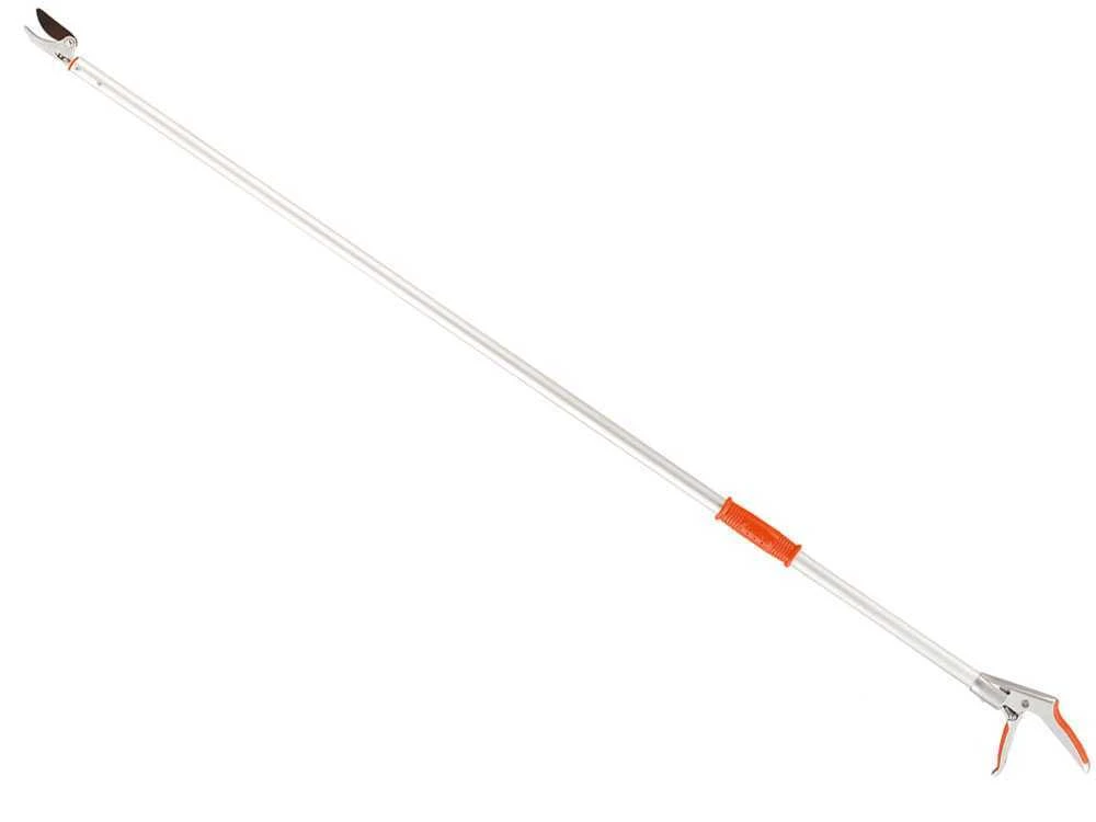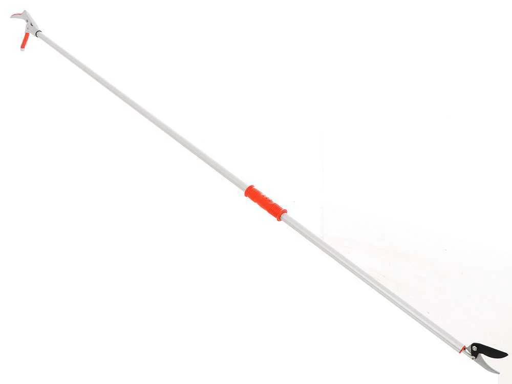 SUPER LÉGÈRE, seulement 854 g. Avec perche en aluminium de 200 cm à coupe orientable, robuste poignée également en aluminium, sécateur à lame revêtue de teflon et coupe Bypass.