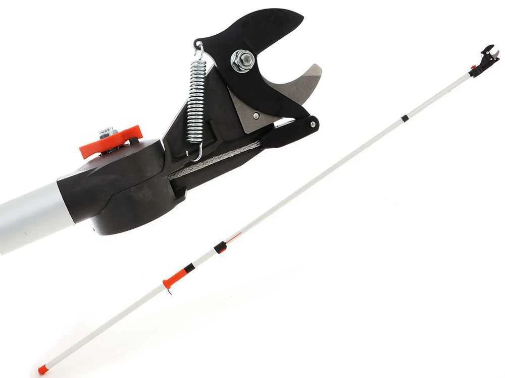 Le système de coupe est activable par le biais de la poignée coulissante le long de la perche.