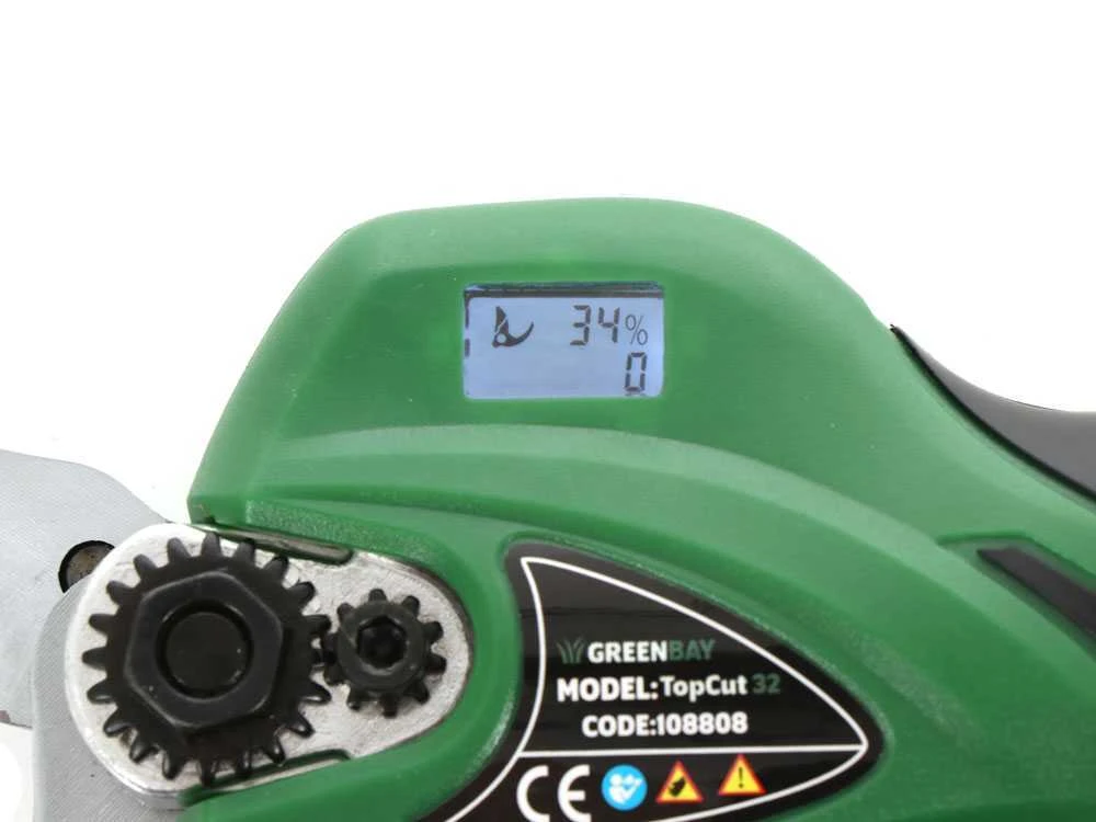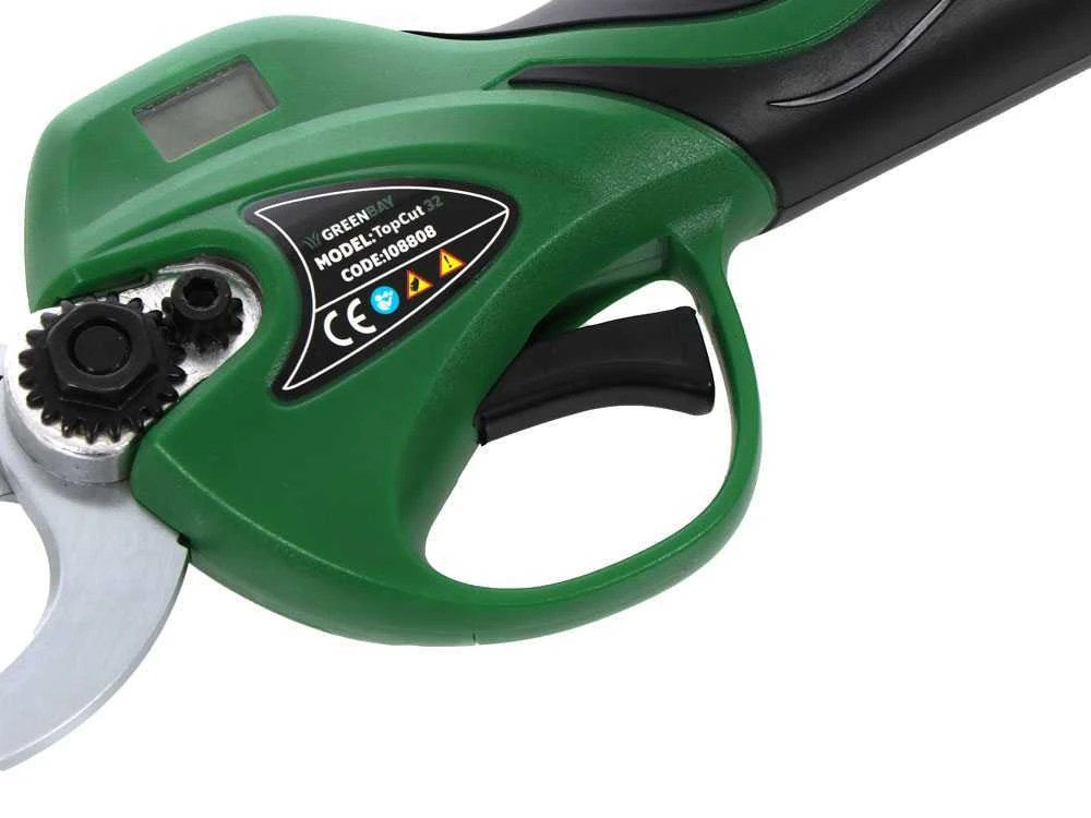 Le sécateur électrique GreenBay TopCut 32 permet d’effectuer des coupes jusqu’à 32 mm en fonction du type de bois, il est possible d’utiliser la gâchette comme expliqué dans les instructions dans le but de réduire l’ouverture des lames et par conséquent accélérer la phase de coupe du sécateur.