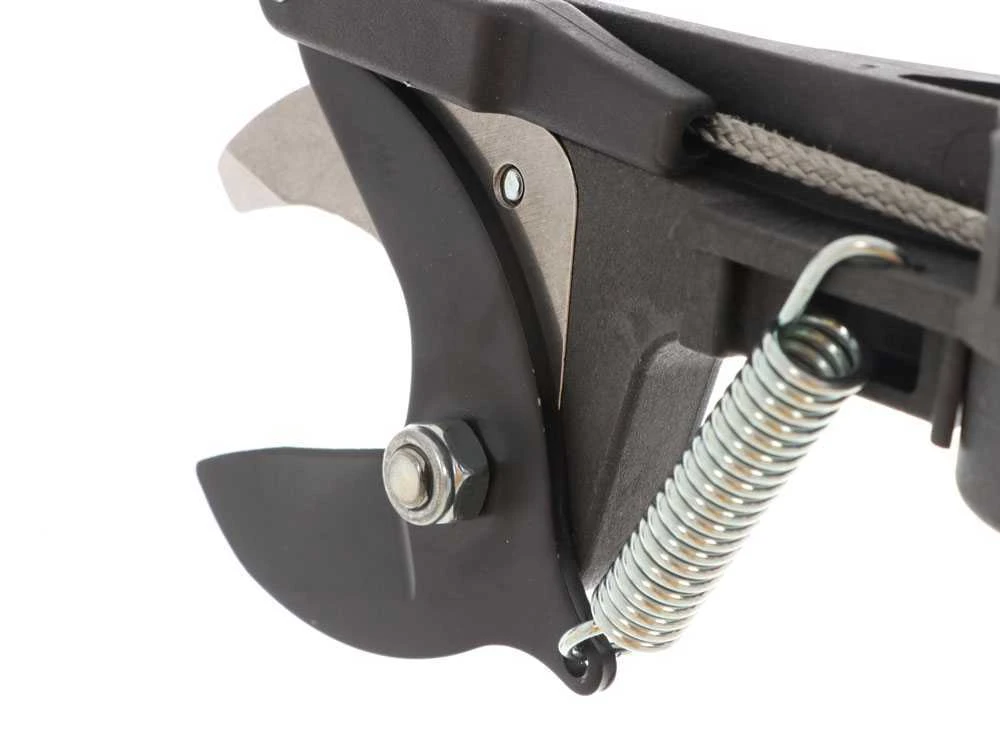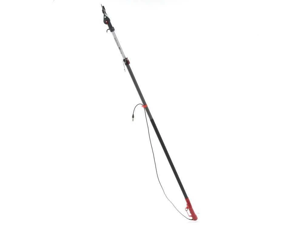 A partir de 265 cm, la tige peut être étendue jusqu’à 415 cm , tout en restant facile à contrôler grâce à sa poignée ergonomique. La gâchette est positionnée sur un espace assez large afin de rendre l’utilisation moins fatigante pour les mains. L’actionnement est assuré par un bouton de sécurité qui, s’il n’est pas directement enfoncé avec la gâchette, n’activera pas le sécateur sur perche. La perche est revêtue en caoutchouc antidérapant qui garantit un travail rapide même en cas de légère pluie.