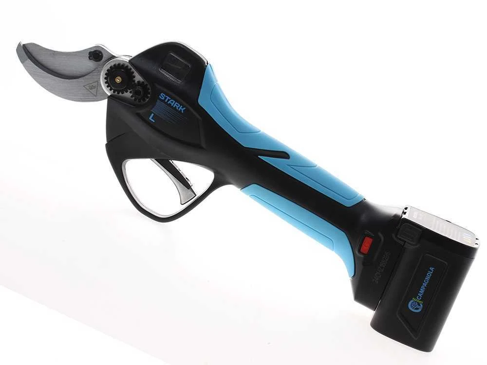 Les sécateurs de taille électronique STARK L Campagnola ont une batterie aux polymères de lithium de 2,5 Ah compacte et châssis léger réalisé en plastique résistant.