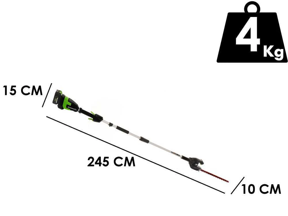 Le taille-haie couvre une hauteur de 247 cm, mais peut être démonté afin d’occuper moins d’espace durant le transport ou le rangement.